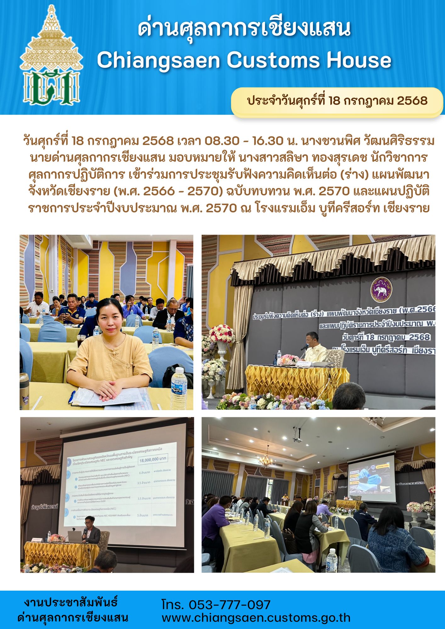 ด่านศุลกากรเชียงแสน เข้าร่วมการประชุมรับฟังความคิดเห็นต่อ (ร่าง) แผนพัฒนาจังหวัดเชียงราย (พ.ศ. 2566 - 2570) ฉบับทบทวน พ.ศ. 2570 และแผนปฏิบัติราชการประจำปีงบประมาณ พ.ศ. 2570 ณ โรงแรมเอ็ม บูทีครีสอร์ท เชียงราย