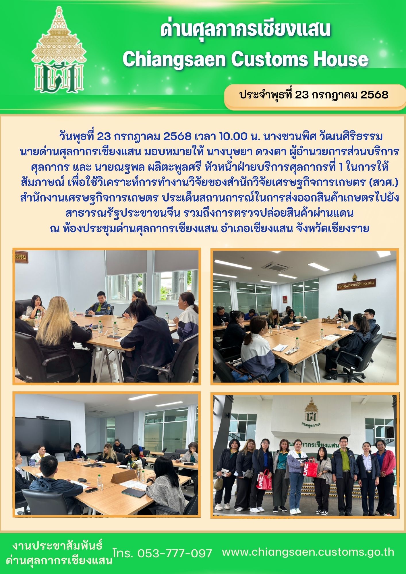 นายด่านศุลกากรเชียงแสน มอบหมายให้ นางบุษยา ดวงตา ผู้อำนวยการส่วนบริการศุลกากร และ นายณฐพล ผลิตะพูลศรี หัวหน้าฝ่ายบริการศุลกากรที่ 1 ในการให้สัมภาษณ์ เพื่อใช้วิเคราะห์การทำงานวิจัยของสำนักวิจัยเศรษฐกิจการเกษตร (สวศ.) สำนักงานเศรษฐกิจการเกษตร ประเด็นสถานการณ์ในการส่งออกสินค้าเกษตรไปยังสาธารณรัฐประชาชนจีน รวมถึงการตรวจปล่อยสินค้าผ่านแดน