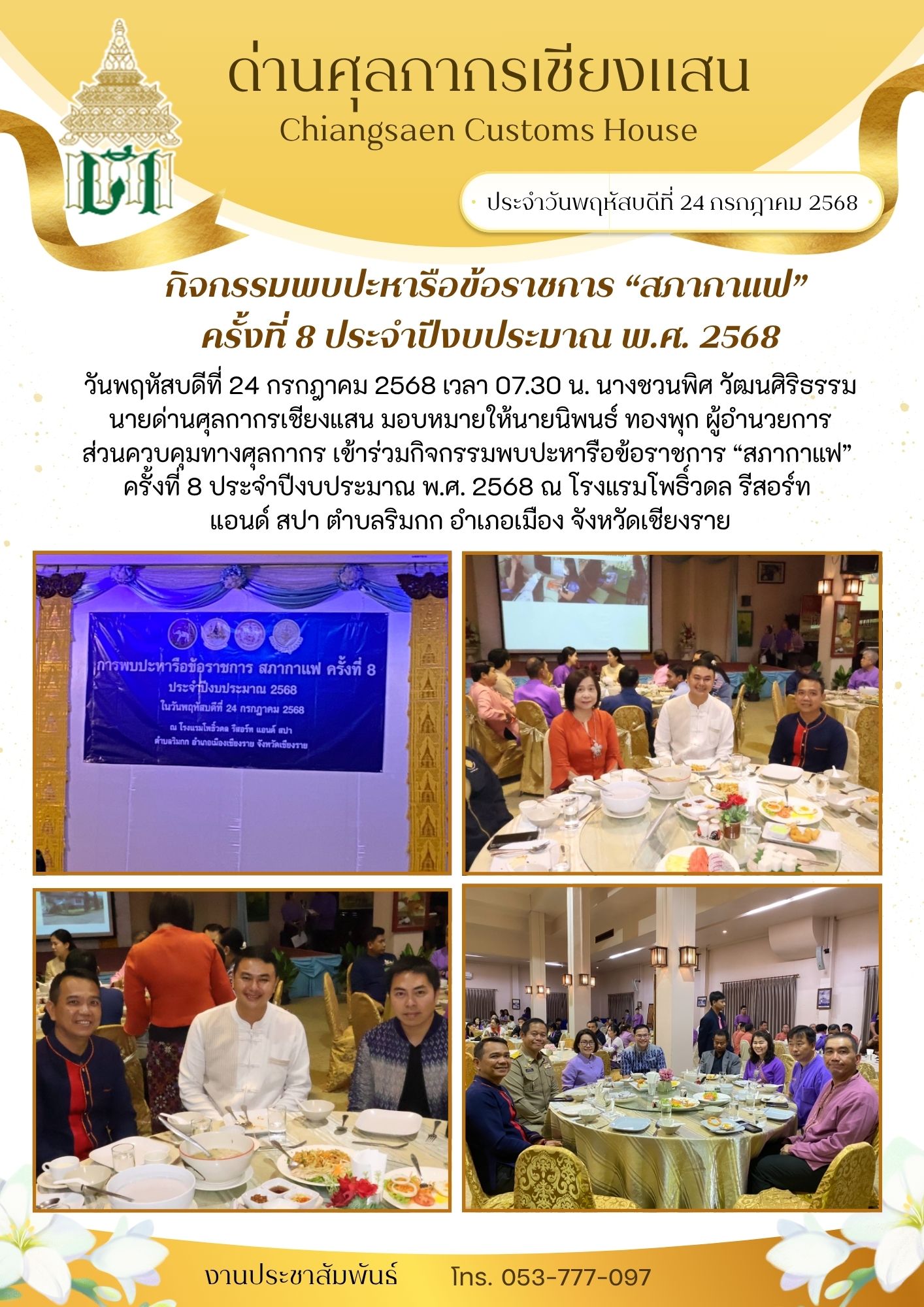 +*+*+ด่านศุลกากรเชียงแสน เข้าร่วมกิจกรรมพบปะหารือข้อราชการ ?สภากาแฟ? ครั้งที่ 8 ประจำปีงบประมาณ พ.ศ. 2568 ณ โรงแรมโพธิ์วดล รีสอร์ท แอนด์ สปา ตำบลริมกก อำเภอเมือง จังหวัดเชียงราย