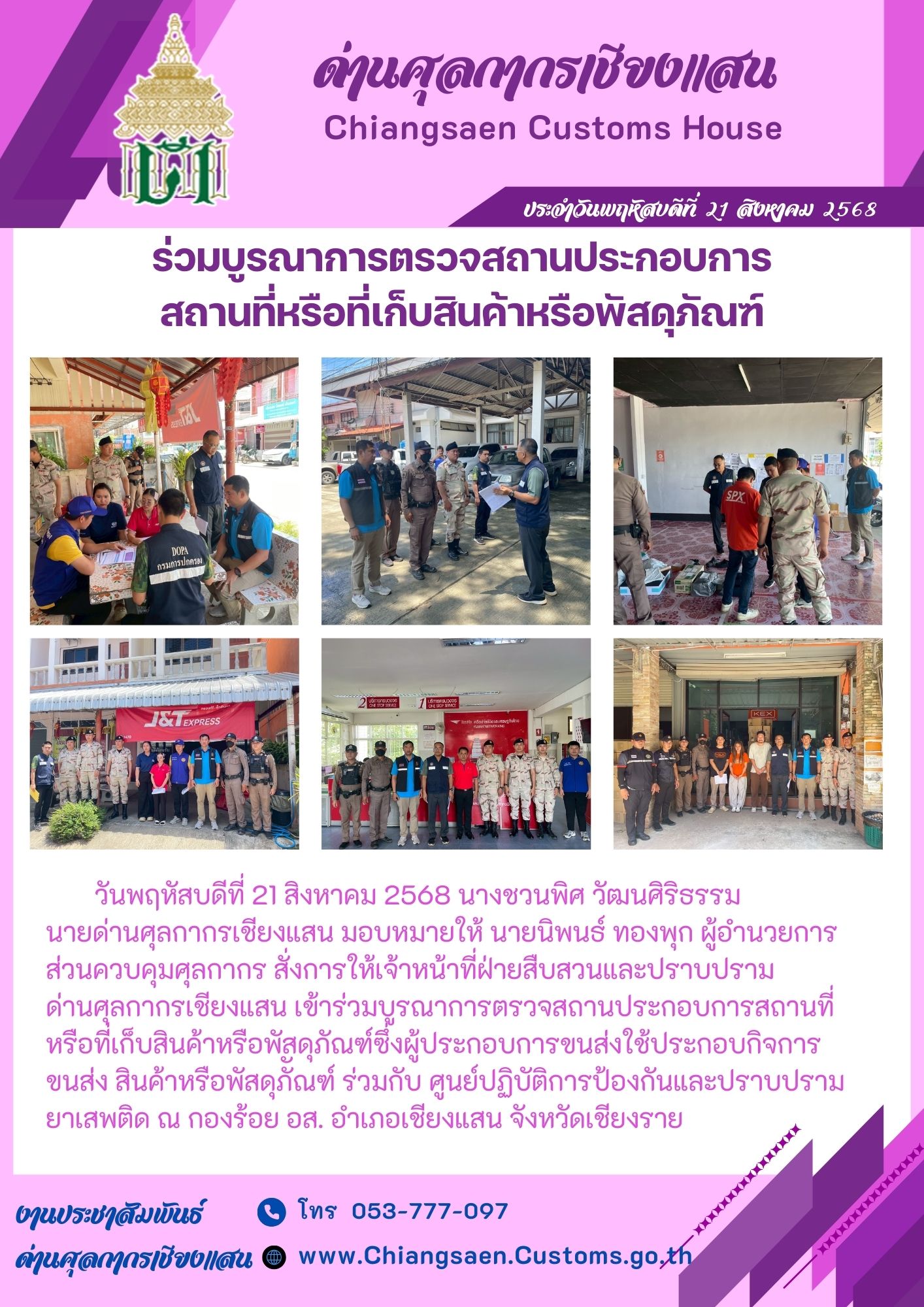 +*+*+ด่านศุลกากรเชียงแสน เข้าร่วมบูรณาการตรวจสถานประกอบการสถานที่หรือที่เก็บสินค้าหรือพัสดุภัณฑ์ซึ่งผู้ประกอบการขนส่งใช้ประกอบกิจการขนส่ง สินค้าหรือพัสดุภััณฑ์ ร่วมกับ ศูนย์ปฏิบัติการป้องกันและปราบปรามยาเสพติด ณ กองร้อย อส. อำเภอเชียงแสน จังหวัดเชียงราย