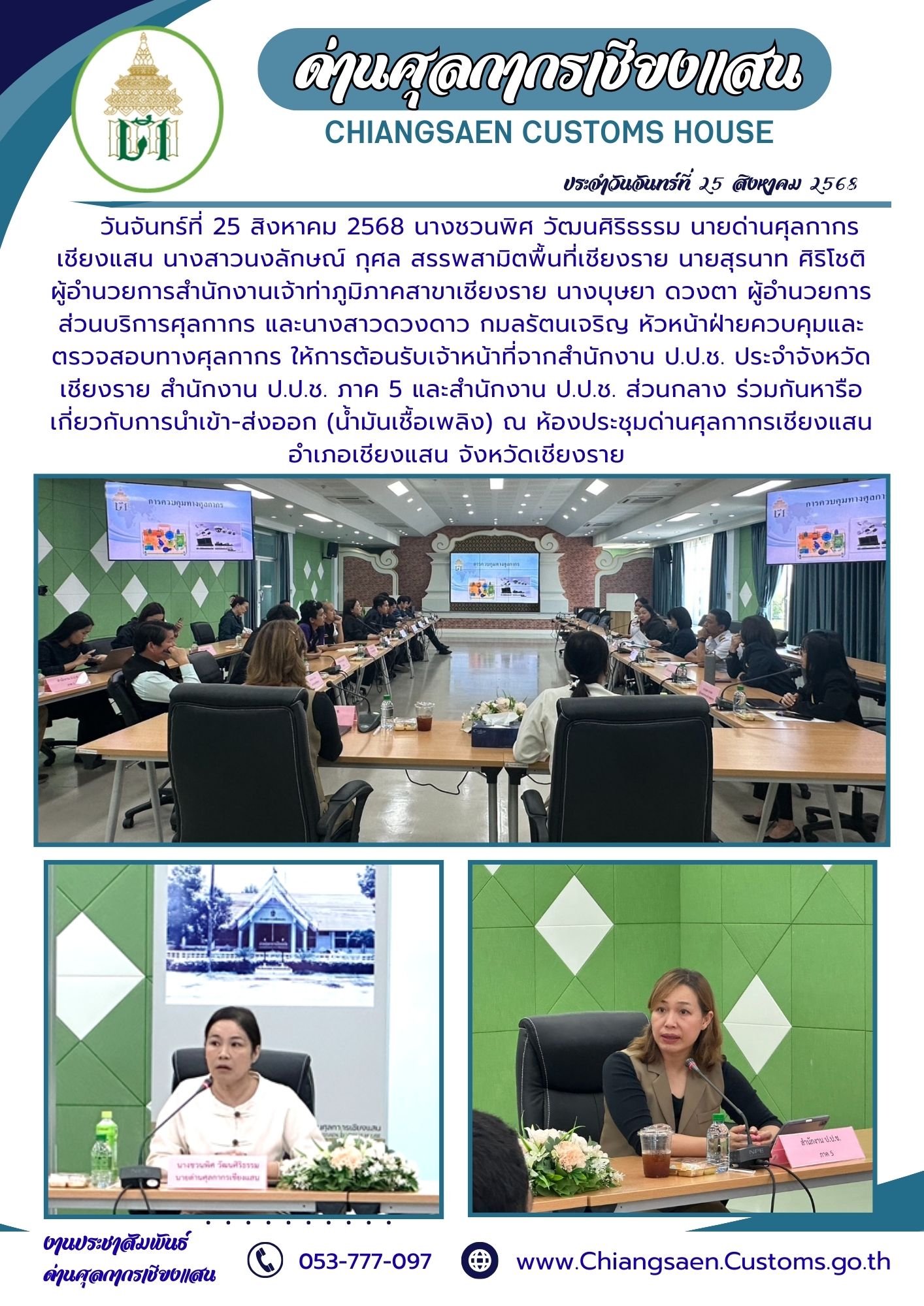 วันจันทร์ที่ 25 สิงหาคม 2568 นางชวนพิศ วัฒนศิริธรรม นายด่านศุลกากรเชียงแสน นางสาวนงลักษณ์ กุศล สรรพสามิตพื้นที่เชียงราย นายสุรนาท ศิริโชติ ผู้อำนวยการสำนักงานเจ้าท่าภูมิภาคสาขาเชียงราย นางบุษยา ดวงตา ผู้อำนวยการส่วนบริการศุลกากร และนางสาวดวงดาว กมลรัตนเจริญ หัวหน้าฝ่ายควบคุมและตรวจสอบทางศุลกากร ให้การต้อนรับเจ้าหน้าที่จากสำนักงาน ป.ป.ช. ประจำจังหวัดเชียงราย สำนักงาน ป.ป.ช. ภาค 5 และสำนักงาน ป.ป.ช. ส่วนกลาง ร่วมกันหารือเกี่ยวกับการนำเข้า-ส่งออก (น้ำมันเชื้อเพลิง) ณ ห้องประชุมด่านศุลกากรเชียงแสน อำเภอเชียงแสน จังหวัดเชียงราย