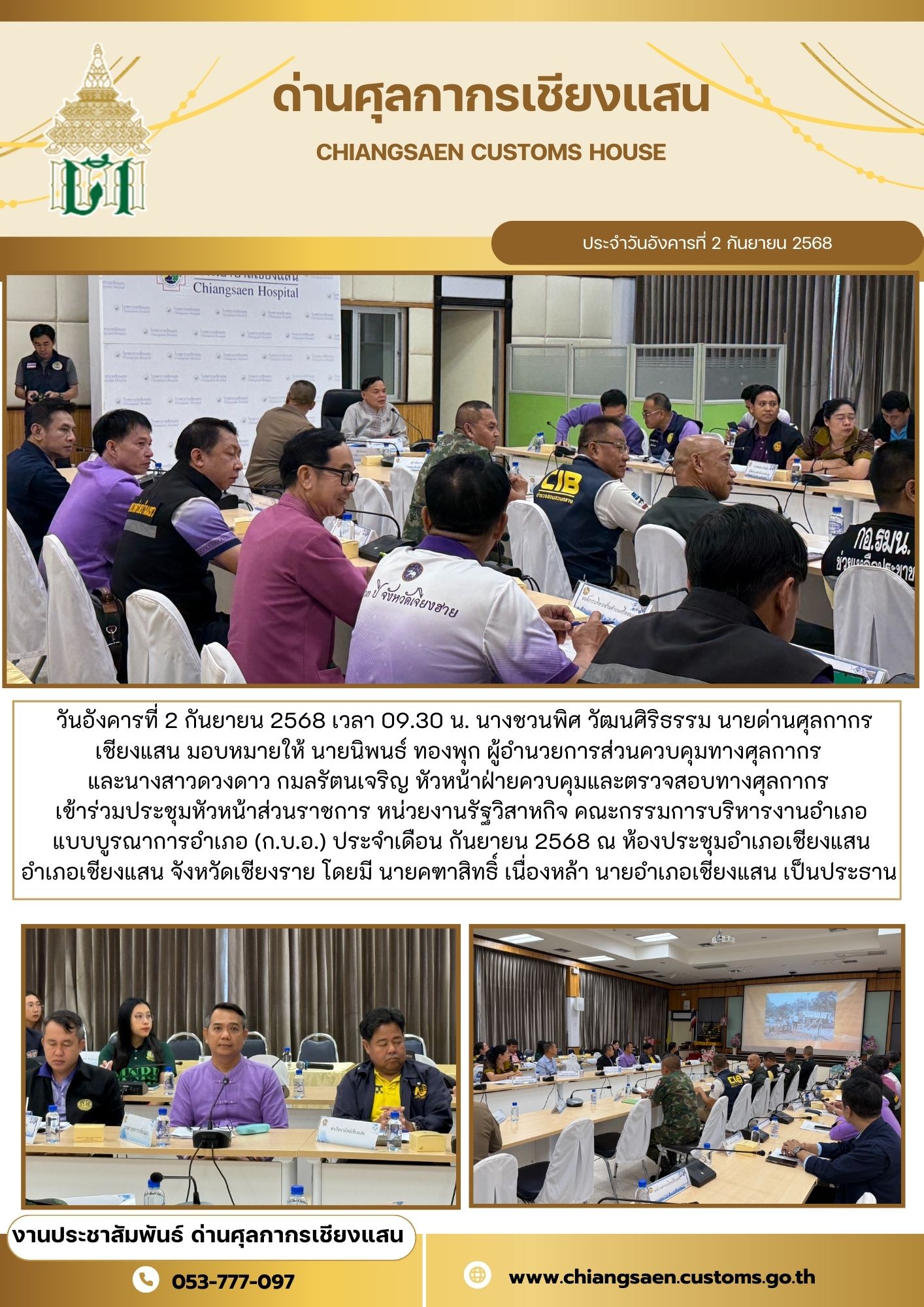 ****ด่านศุลกากรเชียงแสน เข้าร่วมประชุมหัวหน้าส่วนราชการ หน่วยงานรัฐวิสาหกิจ คณะกรรมการบริหารงานอำเภอ แบบบูรณาการอำเภอ (ก.บ.อ.) ประจำเดือน กันยายน 2568 ณ ห้องประชุมอำเภอเชียงแสน อำเภอเชียงแสน จังหวัดเชียงราย