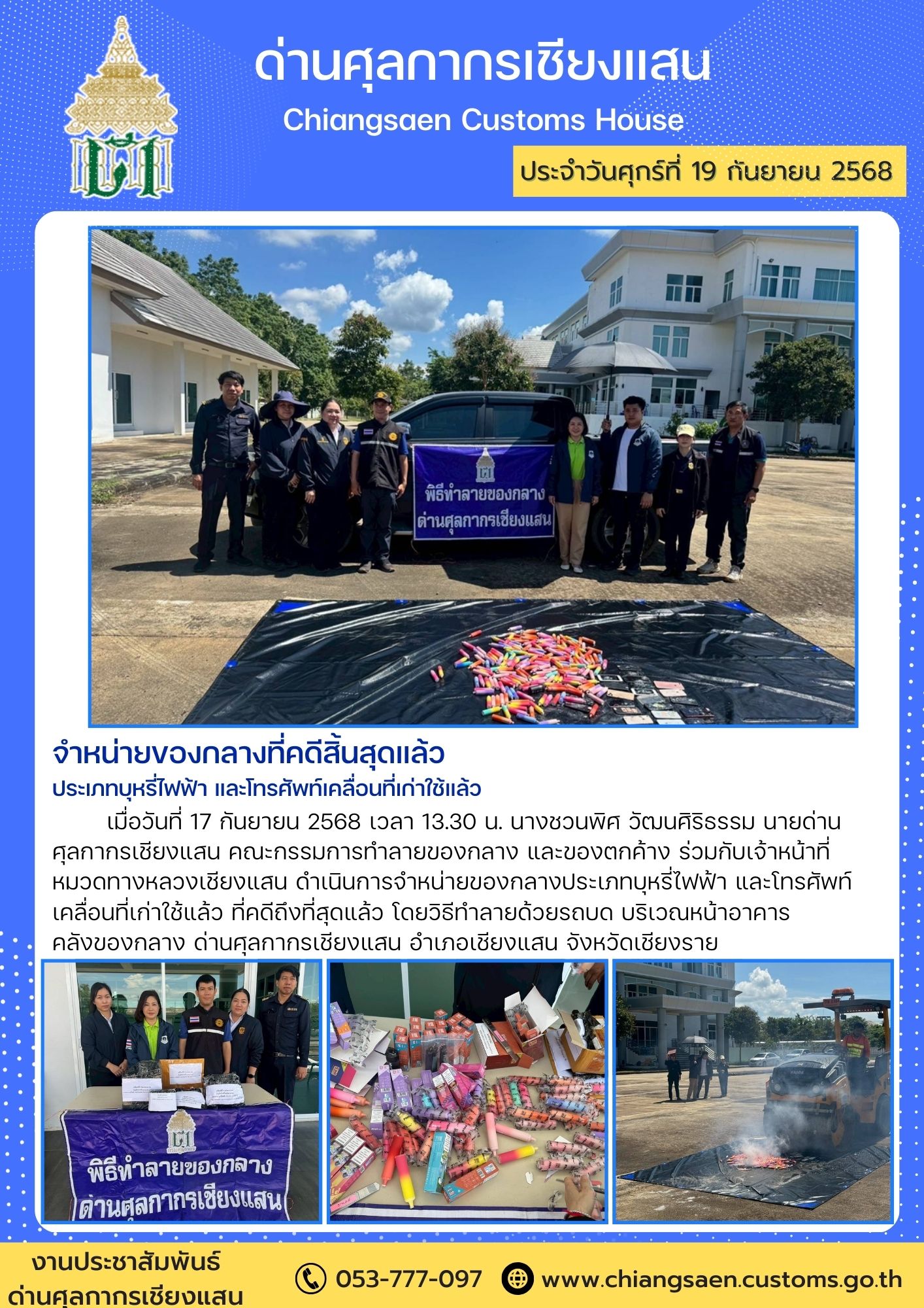 หมวดทางหลวงเชียงแสน ดำเนินการจำหน่ายของกลางประเภทบุหรี่ไฟฟ้า และโทรศัพท์เคลื่อนที่เก่าใช้แล้ว ที่คดีถึงที่สุดแล้ว โดยวิธีทำลายด้วยรถบด บริเวณหน้าอาคาร