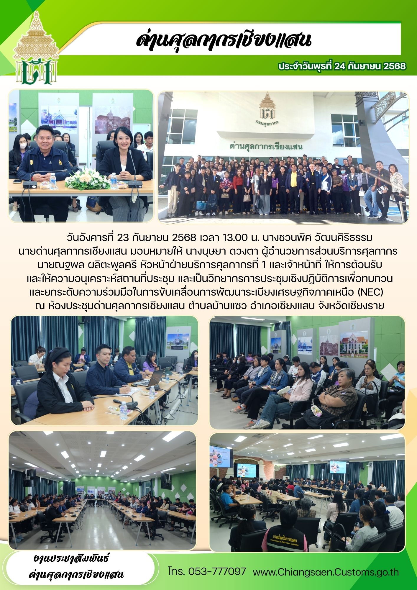 +++ด่านศุลกากรเชียงแสน+++ ให้การต้อนรับ และให้ความอนุเคราะห์สถานที่ประชุม และเป็นวิทยากรการประชุมเชิงปฏิบัติการเพื่อทบทวน และยกระดับความร่วมมือในการขับเคลื่อนการพัฒนาระเบียงเศรษฐกิจภาคเหนือ (NEC) ณ ห้องประชุมด่านศุลกากรเชียงแสน ตำบลบ้านแซว อำเภอเชียงแสน