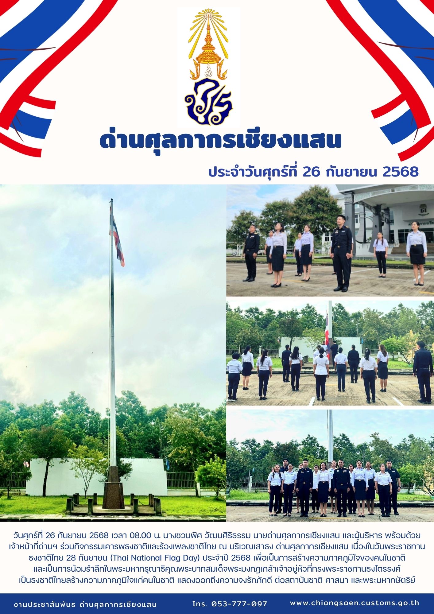 ++++ด่านศุลกากรเชียงแสน และผู้บริหาร พร้อมด้วย เจ้าหน้าที่ด่านฯ ร่วมกิจกรรมเคารพธงชาติและร้องเพลงชาติไทย เนื่องในวันพระราชทาน ธงชาติไทย 28 กันยายน (Thai National Flag Day) ประจำปี 2568 ++