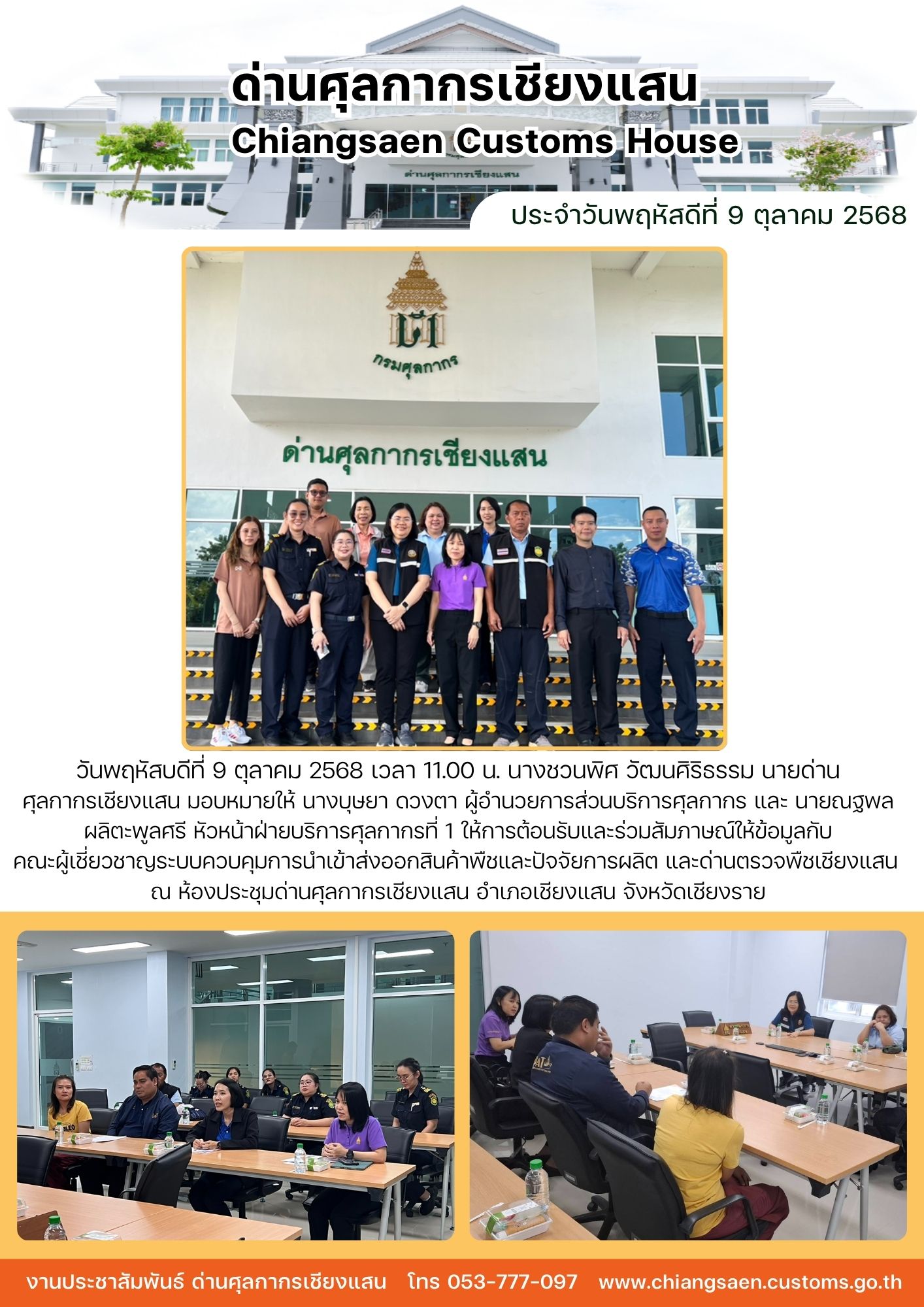 ศุลกากรเชียงแสน มอบหมายให้ นางบุษยา ดวงตา ผู้อำนวยการส่วนบริการศุลกากร และ นายณฐพล ผลิตะพูลศรี หัวหน้าฝ่ายบริการศุลกากรที่ 1 ให้การต้อนรับและร่วมสัมภาษณ์ให้ข้อมูลกับ