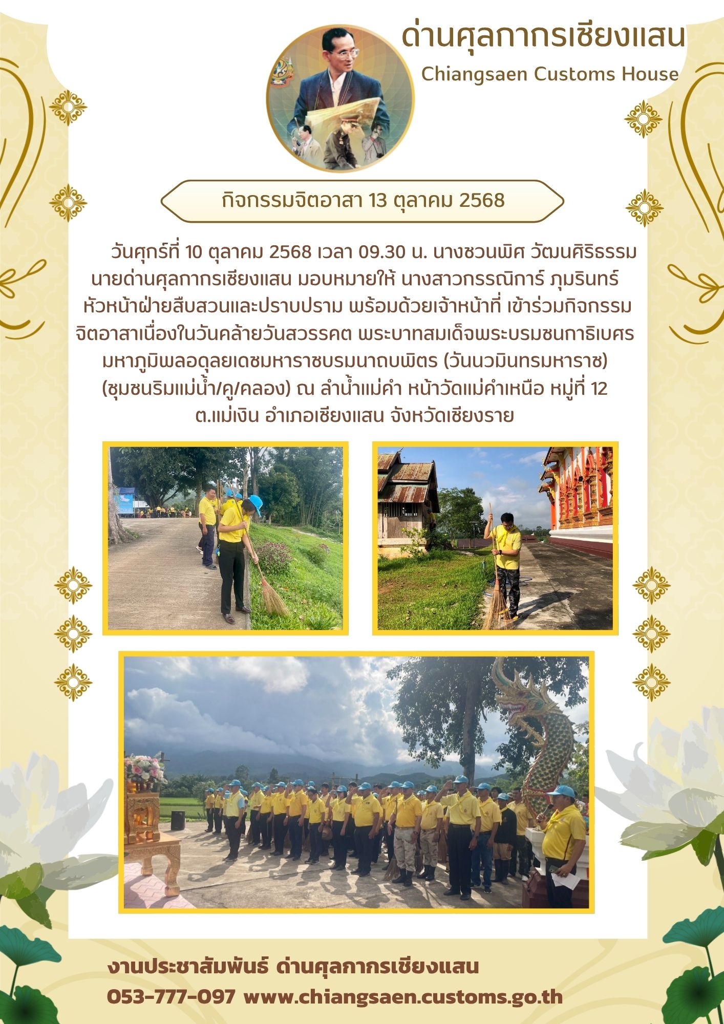 +++ด่านศุลกากรเชียงแสน เข้าร่วมกิจกรรม จิตอาสาเนื่องในวันคล้ายวันสวรรคต พระบาทสมเด็จพระบรมชนกาธิเบศร มหาภูมิพลอดุลยเดชมหาราชบรมนาถบพิตร (วันนวมินทรมหาราช) (ชุมชนริมแม่น้ำ/คู/คลอง) ณ ลำน้ำแม่คำ หน้าวัดแม่คำเหนือ หมู่ที่ 12 ต.แม่เงิน อำเภอเชียงแสน จังหวั