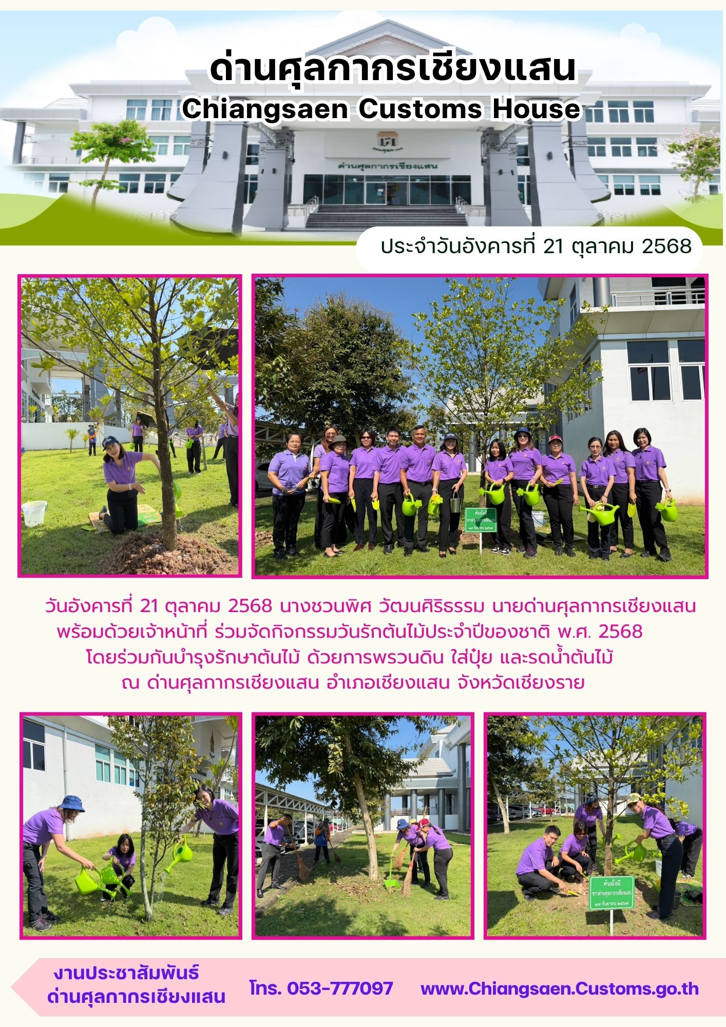 ++++วันอังคารที่ 21 ตุลาคม 2568 ด่านศุลกากรเชียงแสน พร้อมด้วยเจ้าหน้าที่ ร่วมจัดกิจกรรมวันรักต้นไม้ประจำปีของชาติ พ.ศ. 2568 โดยร่วมกันบำรุงรักษาต้นไม้ ด้วยการพรวนดิน ใส่ปุ๋ย และรดน้ำต้นไม้ ณ ด่านศุลกากรเชียงแสน อำเภอเชียงแสน จังหวัดเชียงราย