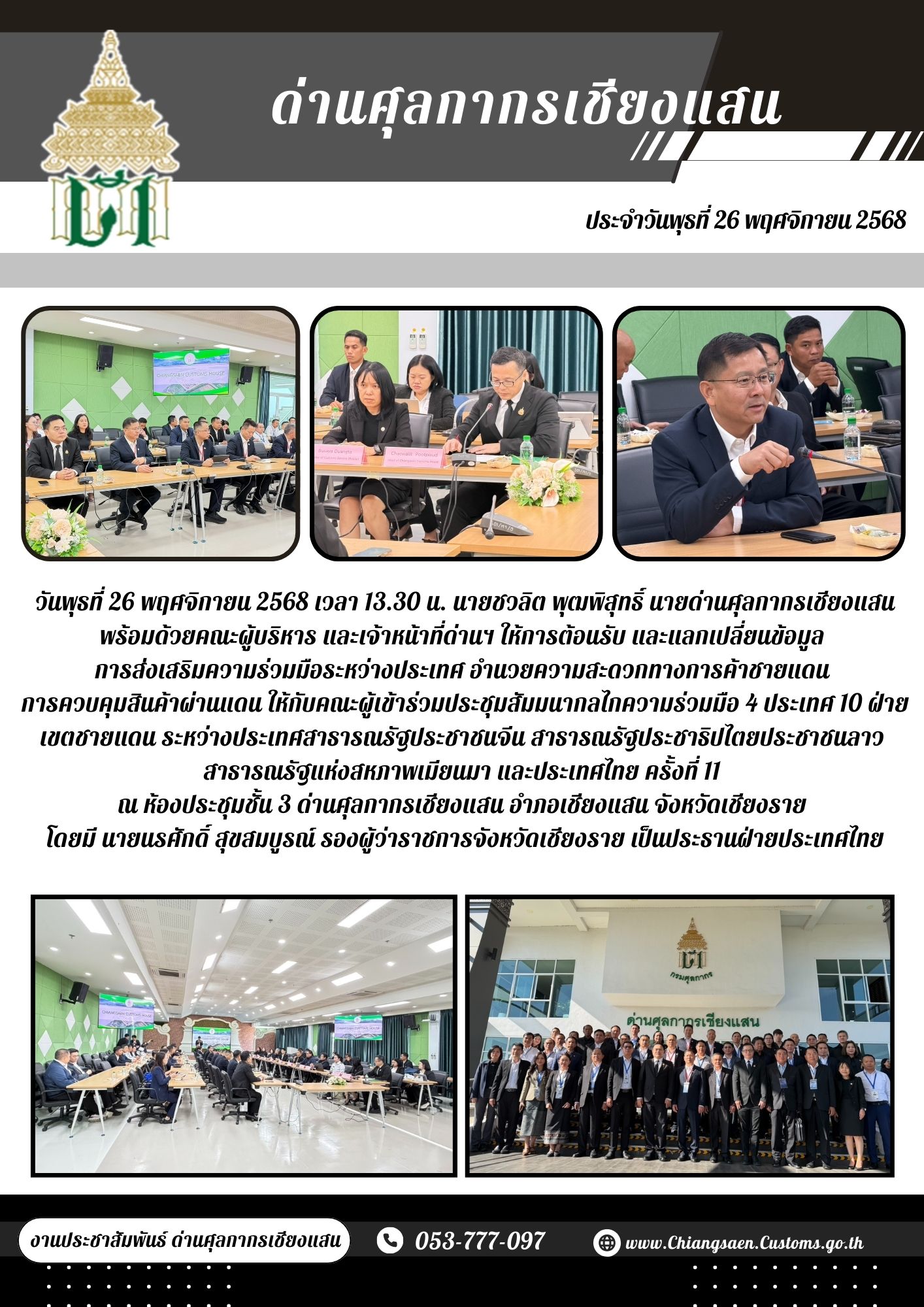 +++ด่านศุลกากรเชียงแสน พร้อมด้วยคณะผู้บริหาร และเจ้าหน้าที่ด่านฯ ให้การต้อนรับ และแลกเปลี่ยนข้อมูล การส่งเสริมความร่วมมือระหว่างประเทศ อำนวยความสะดวกทางการค้าชายแดน การควบคุมสินค้าผ่านแดน ให้กับคณะผู้เข้าร่วมประชุมสัมมนากลไกความร่วมมือ 4 ประเทศ 10 ฝ่ายเขตชายแดน ระหว่างประเทศสาธารณรัฐประชาชนจีน สาธารณรัฐประชาธิปไตยประชาชนลาว สาธารณรัฐแห่งสหภาพเมียนมา และประเทศไทย ครั้งที่ 11 +++