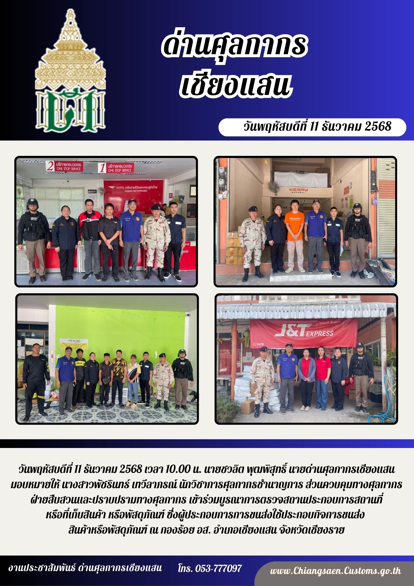 วันพฤหัสบดีที่ 11 ธันวาคม 2568 เวลา 10.00 น. นายชวลิต พุฒพิสุทธิ์ นายด่านศุลกากรเชียงแสน มอบหมายให้ นางสาวพัชรินทร์ เทวีลาภรณ์ นักวิชาการศุลกากรชำนาญการ ส่วนควบคุมทางศุลกากร ฝ่ายสืบสวนและปราบปรามทางศุลกากร เข้าร่วมบูรณาการตรวจสถานประกอบการสถานที่