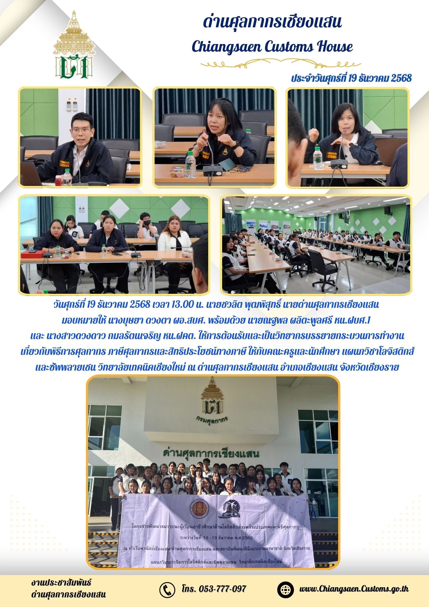 วันศุกร์ที่ 19 ธันวาคม 2568 เวลา 13.00 น. นายชวลิต พุฒพิสุทธิ์ นายด่านศุลกากรเชียงแสน