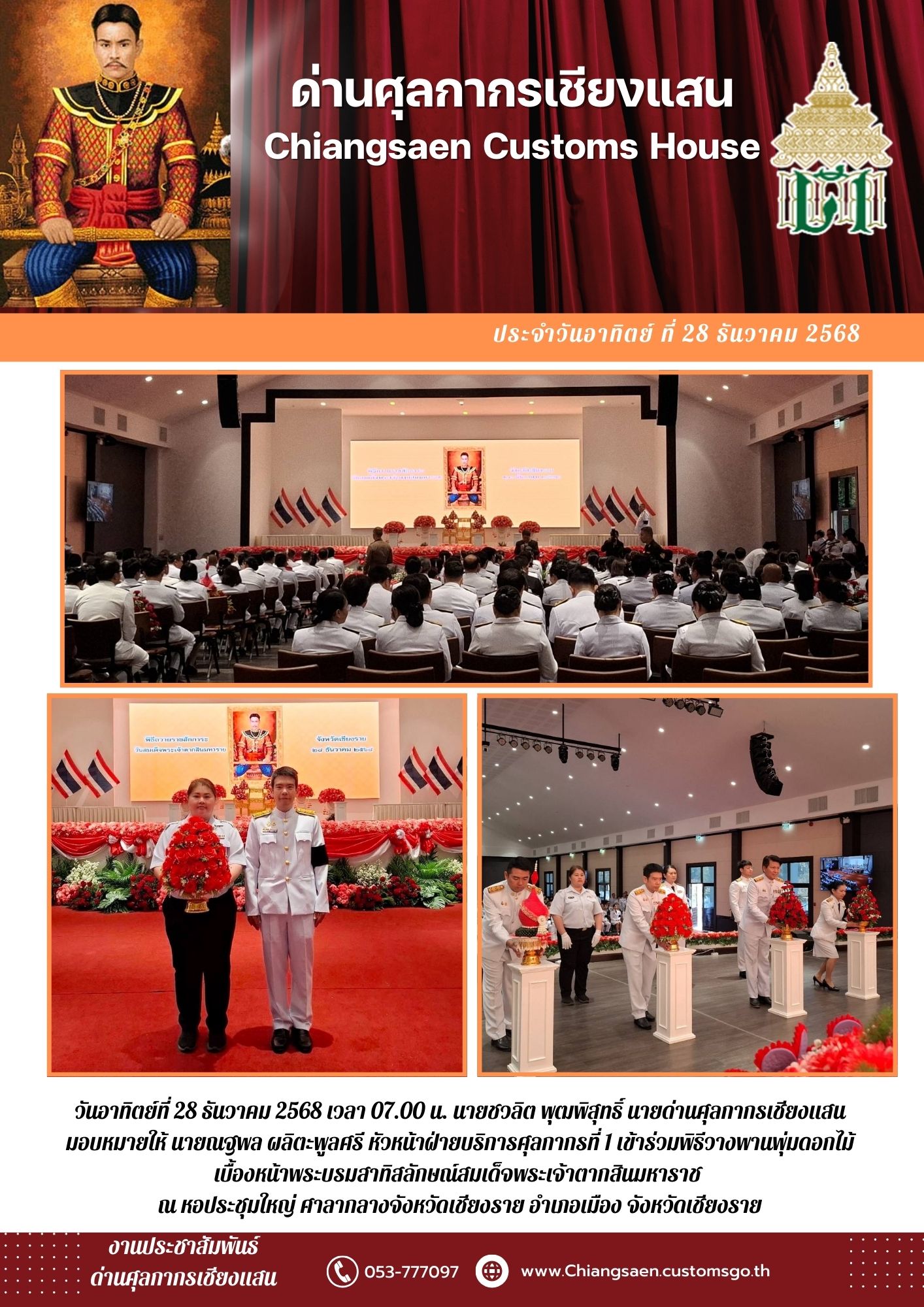 นายณฐพล ผลิตะพูลศรี หัวหน้าฝ่ายบริการศุลกากรที่ 1 ได้รับมอบหมายจาก นายชวลิต พุฒพิสุทธิ์ นายด่านศุลกากรเชียงแสน เข้าร่วมพิธีถวายราชสักการะเนื่องในวันสมเด็จพระเจ้าตากสินมหาราช ประจำปี 2568 ในวันที่ 28 ธันวาคม 2568