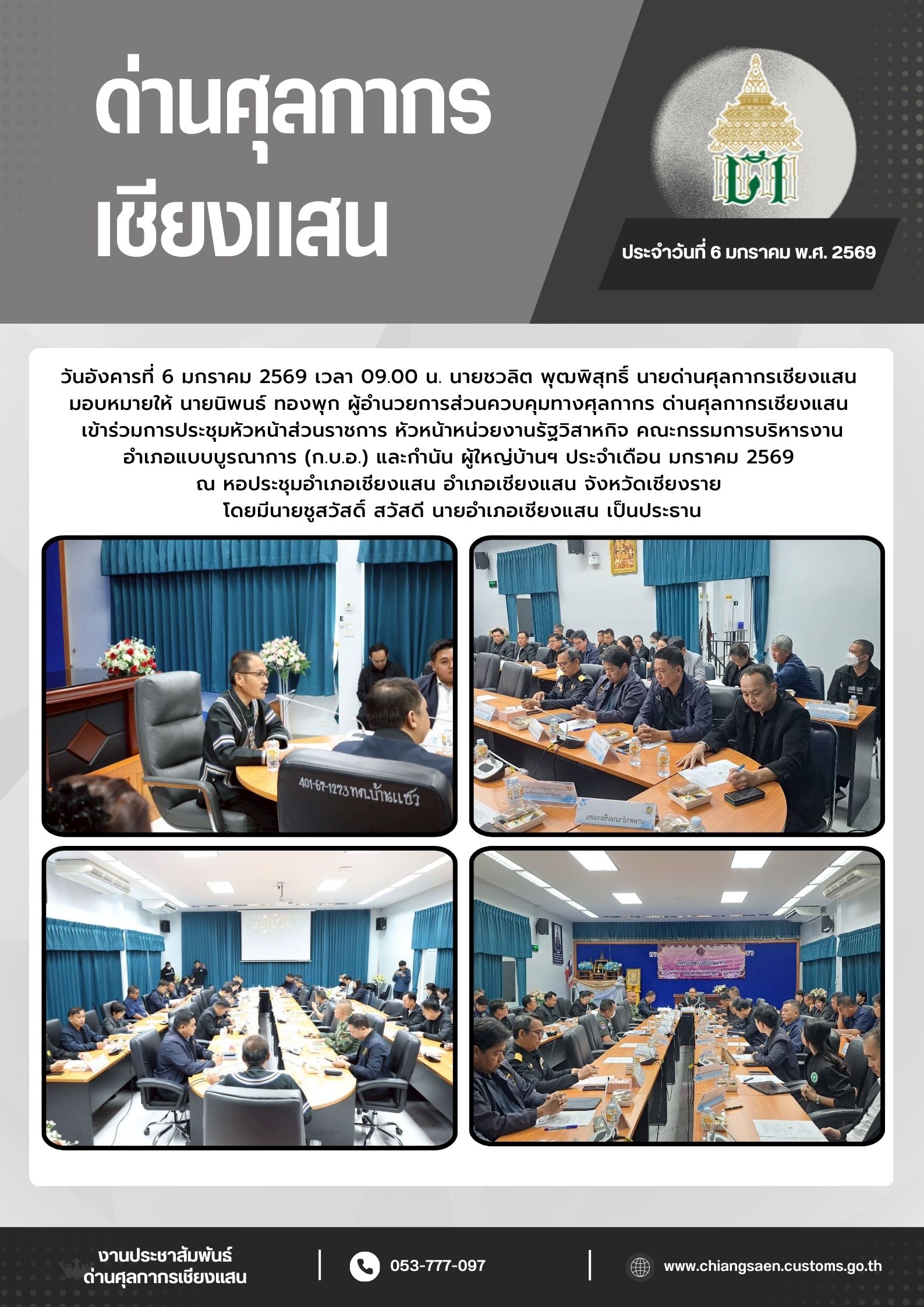 +++ด่านศุลกากรเชียงแสน เข้าร่วมการประชุมหัวหน้าส่วนราชการ หัวหน้าหน่วยงานรัฐวิสาหกิจ คณะกรรมการบริหารงานอำเภอแบบบูรณาการ (ก.บ.อ.) และกำนัน ผู้ใหญ่บ้านฯ ประจำเดือน มกราคม 2569 +++