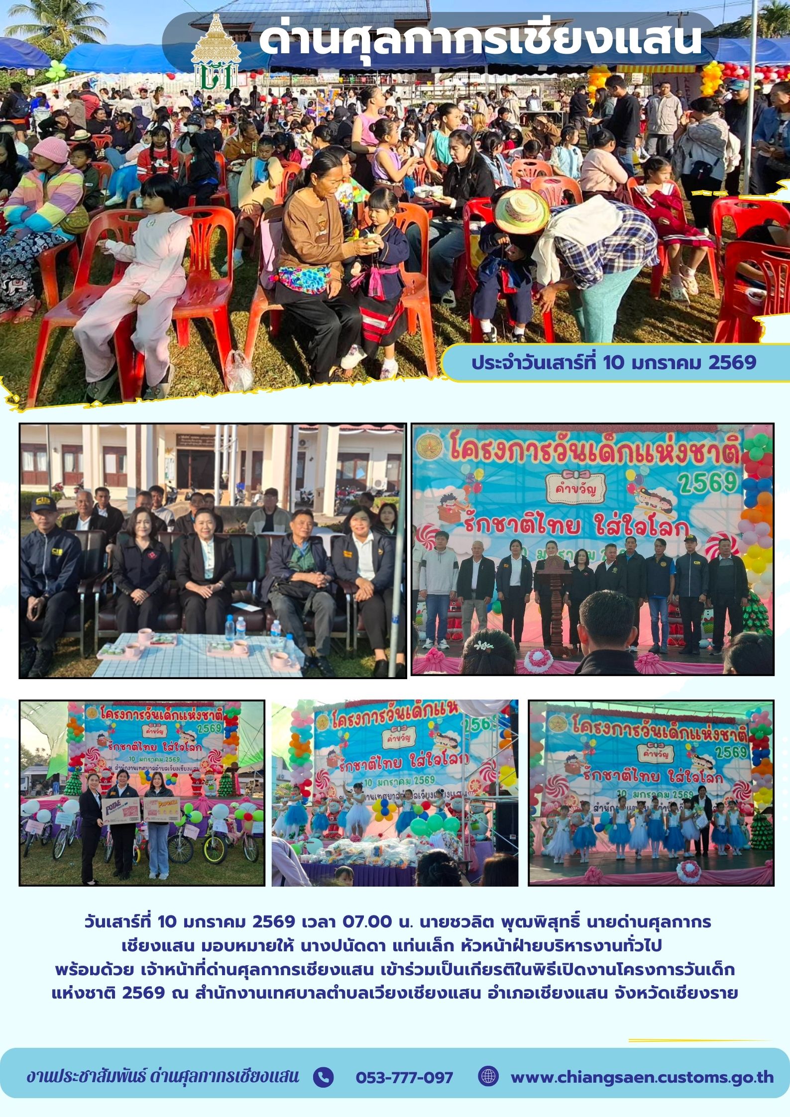 +++ด่านศุลกากรเชียงแสน เข้าร่วมเป็นเกียรติในพิธีเปิดงานโครงการวันเด็กแห่งชาติ 2569 ณ สำนักงานเทศบาลตำบลเวียงเชียงแสน อำเภอเชียงแสน จังหวัดเชียงรา
