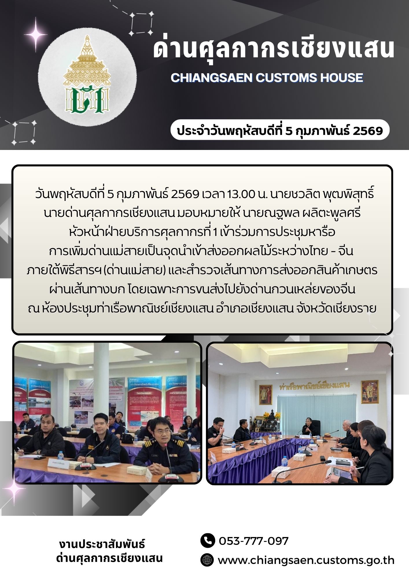 วันพฤหัสบดีที่ 5 กุมภาพันธ์ 2569 เวลา 13.00 น. นายชวลิต พุฒพิสุทธิ์ นายด่านศุลกากรเชียงแสน มอบหมายให้ นายณฐพล ผลิตะพูลศรี หัวหน้าฝ่ายบริการศุลกากรที่ 1 เข้าร่วมการประชุมหารือ