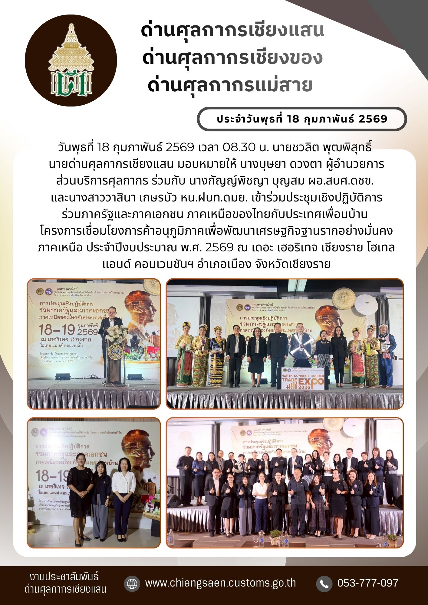+++ด่านศุลกากรเชียงแสน ด่านศุลกากรเชียงของ และด่านศุลกากรแม่สาย เข้าร่วมประชุมเชิงปฏิบัติการ ร่วมภาครัฐและภาคเอกชน ภาคเหนือของไทยกับประเทศเพื่อนบ้าน โครงการเชื่อมโยงการค้าอนุภูมิภาคเพื่อพัฒนาเศรษฐกิจฐานรากอย่างมั่นคงภาคเหนือ ประจำปีงบประมาณ พ.ศ. 2569 +++