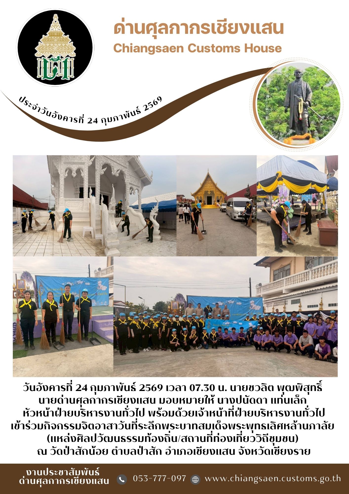 +++ด่านศุลกากรเชียงแสน เข้าร่วมกิจกรรมจิตอาสาวันที่ระลึกพระบาทสมเด็จพระพุทธเลิศหล้านภาลัย (แหล่งศิลปวัฒนธรรมท้องถิ่น/สถานที่ท่องเที่ยววิถีชุมชน) ณ วัดป่าสักน้อย ตำบลป่าสัก อำเภอเชียงแสน จังหวัดเชียงราย