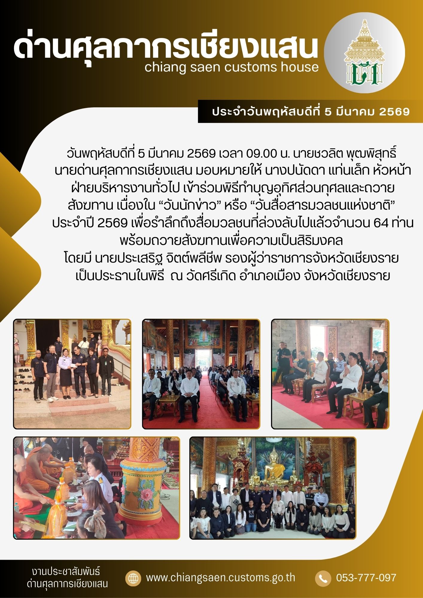 +++ด่านศุลกากรเชียงแสน เข้าร่วมพิธีทำบุญอุทิศส่วนกุศลและถวายสังฆทาน เนื่องใน ?วันนักข่าว? หรือ ?วันสื่อสารมวลชนแห่งชาติ? ประจำปี 2569 เพื่อรำลึกถึงสื่อมวลชนที่ล่วงลับไปแล้วจำนวน 64 ท่าน พร้อมถวายสังฆทานเพื่อความเป็นสิริมงคล +++
